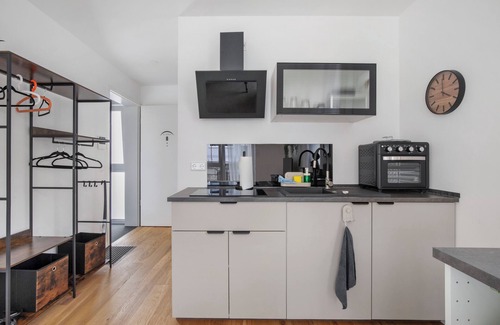 The studio apartment Ay Homes 08 with step-free interior is located in Augsburg and is the ideal accommodation for a relaxing getaway. The 25 m² property consists of a living/sleeping area, a well-equipped kitchen and 1 bathroom and can therefore accommodate 2 people. Additional amenities include high-speed Wi-Fi (suitable for video calls) with a dedicated workspace for home office as well as a smart TV with streaming services. The building in which the accommodation is located has an elevator. This studio apartment features a private balcony for evening relaxation.