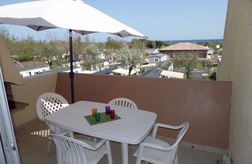 Apartment on the 2nd and last floor. Living room with sofa bed, TV, equipped kitchen, mezzanine with 140cm bed, cabin area with 2 bunk beds, shower room with toilet. Terrace with sea view. Private parking in secure residence.