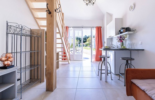 The studio at Château Trompette, located 5 minutes from Saint Gilles Croix de Vie and 10 minutes from the beaches, invites you to relax in a peaceful environment. The kitchenette and private terrace allow you to prepare your meals, organize barbecues, and enjoy them outdoors. The sleeping area is on a mezzanine under the eaves, accessible by stairs. Cycle paths just a few meters away lead you easily to the town or the beach. The property has a woodland where deer live, and some hens provide, depending on the season, fresh eggs upon your arrival. Three curious cats watch over the estate. In the gardens, lounge chairs placed in the shade or sun invite you to relax. The thatched roof ensures quiet nights without outside disturbances.