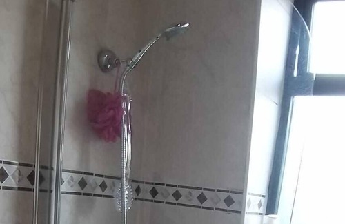 There is one bathroom, which has a toilet and sink and a walk-in shower.