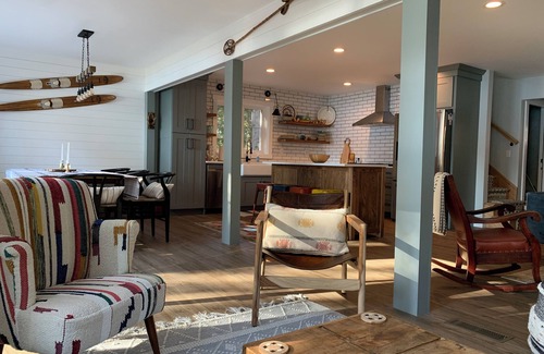 The kitchen is a cook's dream with a sleek layout including an island for 4, table for 10 (12 w/kids), modern appliances and the use of an outdoor grill. Spices, cooking oils, condiments will be available in the stocked pantry for renters' convenience. The property also includes WiFi, cable and streaming services, washer/dryer, and AC. Permanent baby gates have been installed at top and bottom of stairs for toddler safety. Hosts also have a large supply of books, toys, indoor board games, a PS5 gaming station and outdoor games/sports equipment (bikes, corn hole, giant Jenga, basketball, etc...) for guests. Large supply of beach towels is also provided for renters' convenience. Historic downtown Northville, with casual dinning, shopping and groceries, is a scenic six minute drive away. Beautiful hiking trails are within 5-20 minutes from the cottage. Pickleball enthusiasts can join as guests at a beautiful local club during your stay. Forms and information will be available at the house.