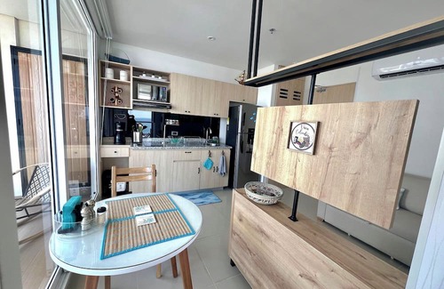 Experience an unforgettable Beachfront stay in Santa Marta, in this totally new adorable 1-bedroom apartment!! The cozy space features a welcoming living room that doubles as an extra sleeping space (sofa bed) with its own air conditioner, a TV stand with WiFi, Netflix and cable channels included; a fully equipped kitchen with small electric stove, refrigerator, microwave and a complete coffee station; a dinning area with full pair of electric curtains (one sheer layer for natural light and a blackout layer for complete privacy); a balcony #1 with partial view of La Bahia and La Marina, that includes two rocking chairs with a coffee table, perfect for relaxing after a day of exploring or night conversations. For your convenience, you'll also find expandable drying clothes racks (2), cleaning supplies, and a small beach umbrella. Guests can unwind in the comfortable bedroom that features a queen bed with a beautiful wooden and illuminated second TV stand, which also has space for personal small items, and two luggage racks. The bedroom also has its own air conditioner and electric pair of curtains (natural light and blackout layers). A cozy private balcony #2 with excellent front views of the Ocean and perfect for the most amazing sunrises, morning coffee or to enjoy the gorgeous well-known Samarian sunsets, for an evening wine. I also has its own chairs and coffee table. Main closet includes space for both hanging and folded clothing, a small umbrella for raining days and equipped with an iron and full-size ironing board. The bathroom is fully equipped with amenities such as, towels, shampoo, conditioner and wash body, toilet with included bidet; along with a hairdryer and full mirror that doubles as cabinets. The apartment is located in a new building in which guests can access to the rooftop, that includes an amazing infinity pool for adults and another for children, hot tubs (jacuzzi), sauna, steam room (turco), gym, a public spa business that offers services of massages and wellness therapies by appointment, and On-site bar with a quiet and relaxed atmosphere, perfect for afternoons and early nights . The apartment has also its own private parking space inside the building. Enjoy a privileged location; just steps from the supermarket (Carulla), coffee shops and several restaurants offering a variety of cuisines, including Italian, Spanish, Steakhouse, Mediterranean, seafood, and Thai menus. Just a short stroll to "La Marina", where boat tours depart daily to nearby beautiful beaches such as, El Rodadero and the world-famous "Tayrona National Park." Within 7-10 minutes walking distance, you'll find the popular and lively "Parque de Los Novios" the city's vibrant hub of restaurants, shops, bars, and nightlife. Reserve your stay in this stylish retreat and experience the perfect mix of relaxation, culture and Caribbean charm. Book now and make remarkable memories by the sea!!