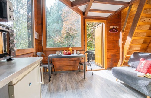 You will be staying in a 1-room terraced house with an area of 25 square meters, spread across two levels. The living/dining room leads to a balcony. There is a kitchenette equipped with a mini-oven, two ceramic glass hob hotplates, a kettle, microwave, and an electric coffee machine. The property also features a shower/WC. On the upper floor, accessible via a steep stair, you'll find a gallery with a ceiling height ranging from 150 to 215 cm, where a French bed (160 cm, length 190 cm) is situated. There is also a TV in this open-plan sleeping area.