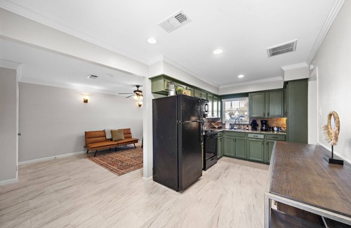 • Stylish Kitchen: The kitchen features attractive green cabinetry and is fully stocked with appliances and cookware.