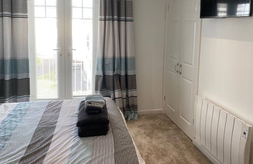 Master bedroom with king sized bed, built in wardrobes, bedside cabinets and Juliet balcony. There is a wall mounted Smart TV. En-suite shower room with shower, sink and WC. Blackout curtains