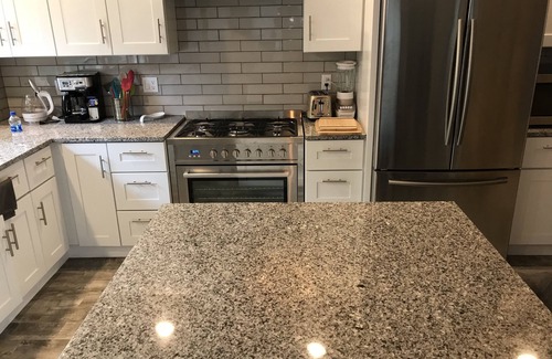 Our house was completely remodeled in 2017, creating a stylish open plan living and dining area with vaulted ceilings, a granite and stainless steel dream kitchen with two sinks and a huge island for cooking and conversation -- and four bar stools for breakfast and snacks. We have a big stainless refrigerator with an ice maker, a microwave, a 36-inch gas range, blenders, coffee makers, a full set of top end cookware, good knives, and china, cutlery and glassware for eight or more.