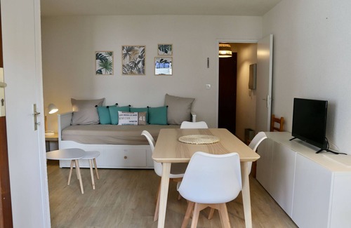 In Seignosse-le-Penon, this fully renovated one-bedroom apartment is located at the foot of the Landes dunes and close to shops. It's ideal for a vacation within walking distance. Located on the first floor, it features a bright and spacious living room with a 160x200cm sofa bed (2 x 80cm), an alcove with a single bunk bed (not suitable for children under 6), and a separate bedroom with a 160x200cm bed (2 x 80cm). You'll also find a fully equipped kitchen (Tassimo coffee maker, toaster, microwave, kettle, etc.) and a bathroom with a toilet.