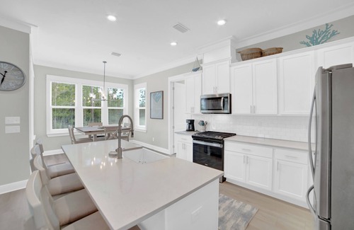 Step inside to discover a spacious open living area, complete with a fully equipped kitchen featuring a large island, granite countertops, stainless steel appliances, and a convenient 4-burner gas stove. Whether you're preparing a family meal or whipping up snacks for a beach picnic, you'll find everything you need right at your fingertips. Plus, with a full-sized washer and dryer available, you can keep your beach towels and swimsuits fresh and clean throughout your stay.