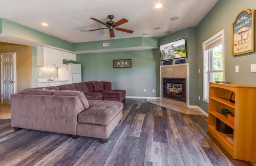 Arrive, park and easily transport your luggage and groceries into the home via a convenient cargo lift. The first thing you’ll notice is the side-yard pool and four-person hot tub, an oasis of relaxation that will have you changing into swimsuits not long after you settle in. There’s also an outdoor shower for added convenience as well. Just inside off the pool deck is a game room featuring a pool table to elevate everyone’s competitive spirit. The room also has a 50-inch Smart TV, a full-size refrigerator to keep cold drinks at the ready and a wet bar. Completing this level is a half-bath and a king bedroom suite with a private full bath.