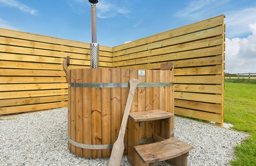 Amenities: Gas central heating with underfloor heating. Electric hob, combi microwave, Airfryer, fridge. Smart TV, WiFi. Fuel, power, and starter pack for wood fired hot tub inc. in rent. Bed linen and towels inc. in rent. Ample parking. Large enclosed garden with lawn, decking, gravelled area, wood-fired hot tub, barbecue, and furniture. Sorry, no pets and no smoking, Shop and pub 0.8 miles, beach 2.3 miles. Note: There is a step up to the decking, and the pod is located on a platform, please take care