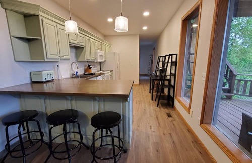 This rental is the primary rental of the house and is the lower level with its own private entrance. When rented as a one bedroom as in this listing, it will sleep 4(1 bedroom with King and sleeper sofa in living room). For additional rental space of this unit as a 3 bedroom, see the listing for The Sunrise House on Lake Ann Lower Level(3 bedroom). In addition there is an apartment for 2 people in the listing Sunrise House on Lake Ann Apartment. This space is an amazingly beautiful peaceful space to get away with 1 private bedrooms and 2 full baths, full kitchen with coffee bar, ping pong table, 65" tv, amazing deck with outdoor dining table and couches with fire table. All this on beautiful Lake Ann with its great fishing and amazing limestone cliffs. On the waterfront there is a firepit and multiple paddleboards and kayaks for your use(as well as pfds). Come cook smores on the fire by the lake or read a book on the covered deck looking out over the most peaceful views around!