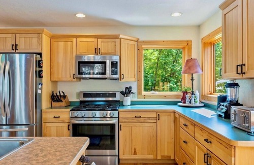 Our spacious home boasts 1.5 acres of tree-covered land with 163 feet of gradual elevation leading directly to the lake, providing breathtaking sunset views from the deck. The house features three cozy bedrooms, a loft area, and three well-appointed bathrooms. The main level impresses with soaring vaulted ceilings, a stunning lakeside wall of windows, and natural wood finishes throughout, including custom log railings and hardwood floors.