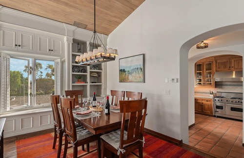 The bright kitchen offers modern-day appliances like a Viking stove with two ovens, a Subzero fridge, plenty of storage, two Subzero wine refrigerators, each with 146 bottle capacity, Reverse Osmosis Water Filtration, a dishwasher, skylights, and local handmade tile countertops. This kitchen is stocked with supplies and is ideal for cooking a delicious meal.