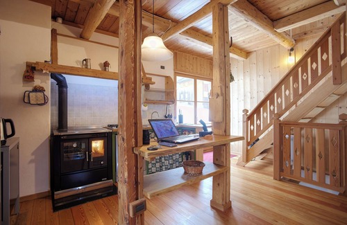 Panoramic chalet converted from an early 1900s barn, surrounded by nature at 1,550 m. Spread over 4 floors: spacious living area with fully equipped kitchen and large windows overlooking the mountains, 2 terraces, 3 bedrooms (2 double and 1 with a 120 cm bed), 2 bathrooms.