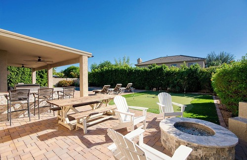 The private backyard is the ultimate gathering space, featuring a sparkling pool, a putting green, and a fire pit for evening conversations. The patio has plenty of seating for lounging and outdoor dining, making it a perfect spot to unwind or entertain.
