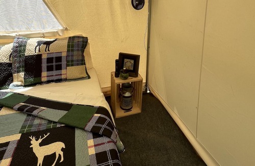The Iceman campsite is located 0.55 miles from the front entry gate. It sleeps up to 6 campers - two on the Queen bed in the 10 x 12 platform safari tent and up to 4 additional campers in a pop-up tent that can be provided for a small fee. The site also comes with a picnic table, fire pit, and Adirondack chairs where you can kick back and take in the stars at night. Our campsite is also pet-friendly with a small pet fee.