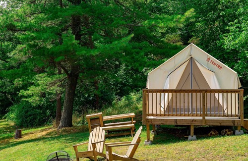 Each campsite includes a 10'x12' safari-style canvas tent on a raised platform, and you'll find one queen bed inside. Larger groups can also use the extra 5-person pop-up dome tent that’s provided (you’re welcome to bring your own camping gear too). You'll also have a 6-ft picnic table, outdoor fire pit, 2 Tentrr Adirondack chairs.