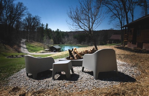 One of three cabins at Terrapin Hideaway, this luxury retreat features a queen bedroom and a pull-out sofa, comfortably accommodating up to four guests. Perched above the property, it offers sweeping views of the grounds and a stunning overlook of the pond. The private backyard patio includes a hot tub and firepit—perfect for a relaxing evening.