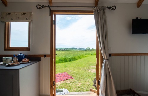 A bespoke handmade oak shepherd's hut, The Acorn has a delightfully styled interior. The accommodation comes complete with a well-equipped kitchenette, a cosy bedroom area with double bed, and a comfortable dining area with two wing back chairs. A shower room with walk-in shower enclosure, wash basin, and fully plumbed flushing WC completes this lovely retreat. With plenty of rural charm, outside is a lawned area with a wooden dining table and chairs, and a firepit where you can sit and enjoy the panoramic countryside views or gaze at the night sky. The double doors let the sunshine flood in, and you can sit in comfort as you enjoy your breakfast, lunch or dinner, listening to the birdsong.
