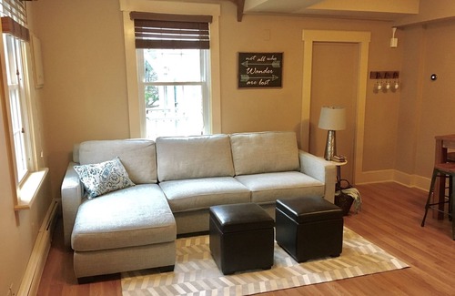 The Annex building is a historic 1850 home right on Main St. in Stowe Village. 2 minute walk to the shuttle! We will consider a dog after speaking with you first. You can step right outside the front door onto Main St. The apartment itself has just been newly furnished, and the kitchen is brand new. The large windows, and wooden beams throughout retain the historic feel of this old building and give it it's charm. This unit has central A/C & New Washer/Dryer.