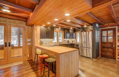 The fully-equipped contemporary kitchen has new appliances, including an induction stovetop, convection oven, microwave and a French-door refrigerator. You'll find a great assortment of gadgets, cookware and bakeware to make your time in the kitchen enjoyable and convenient for creating family meals. The breakfast bar seats three and the rustic kitchen table has seating for six.