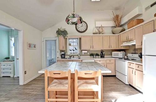 The living room offers a 65 inch LCD Smart TV. The well stocked kitchen is equipped with everything you need to prepare meals, which can be enjoyed at the kitchen island or dining area. Enjoy your cup of coffee or glass of wine in the screened-in front porch. The four-season sunroom in the back of the house is the perfect spot to read, do a puzzle, stream a show on the flat-screen TV, or just enjoy the wind chimes and bird songs.