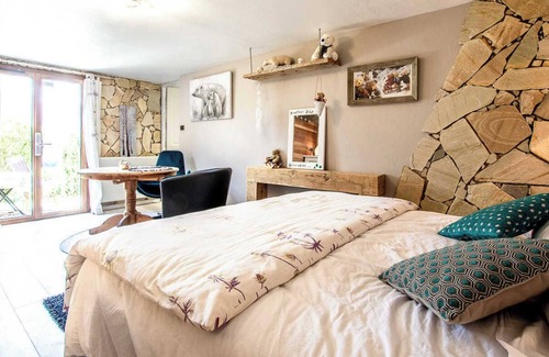 Studio on the ground floor of the owner's house with exterior access. Bedroom with dining area and infrared sauna (1 double bed 160x200cm), bathroom / kitchen area (atypical room with bathroom area (shower and sink) and kitchenette (microwave, fridge, induction hob and sink), separate WC Private terrace Large shared grounds Swimming pool shared with the owners and other holidaymakers on the property (1 independent chalet and 1 guest room). 7km from Albertville, discover The Bear Loft. A big fan of Canada, Nathalie has disseminated here and there nods to her country of heart. To optimize spaces while providing optimal comfort, the water feature includes a functional kitchen area and a modern bathroom area.