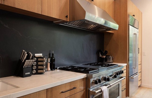 •A fully-equipped kitchen with a floating center island and top-of-the-line Wolf appliances. Enjoy a wide variety of cookware and utensils, coffee three ways (Nespresso, french press and drip), a wine fridge and more