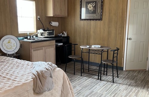 The studio style cabin provides suitable features such as: 1 queen bed, smart TV, WiFi, a kitchenette area with a min fridge, microwave, a griddle with a small toaster oven and coffee maker; towels and other toiletries, linen, iron & ironing board. A baby portable crib is available upon request. There is outdoor grills and picnic tables and other outdoor sitting areas.