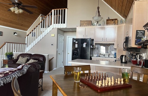 Relatively removed from the noise & congestion of any towns, The Escape Hatch offers a fun basecamp to relax and reconnect. Our three-floor home features a living area, kitchen, 1/2 bath, and Master Suite on the main floor; 2 bedrooms, a full bath, laundry room, kitchenette and family /game room on the bottom floor; and a loft bedroom with it's own bathroom and great views of the lake. We have a stunning wood-burning fireplace in the living room; a propane fire pit on the porch; and an outdoor firepit on the water. The porch is fully screened offering views of the lake - no better place to listen to the wildlife while rocking in a rocking chair or lounging on the outdoor sofa. There are also two spacious open-air decks, the upper of which features an outdoor dining space. Like to cook? Use the gas grill on the deck or we have a small charcoal grill available as well. Relax in the porch swing as you watch the sun set, or have a glass of wine on the dock. Other amenities include high-speed internet, cornhole, darts, two tvs with Roku/Firesticks, and lots of books, games, and puzzles. Check out the stars at night with our telescope - the light pollution on this part of the lake is minimal, offering great views of the nighttime skies.