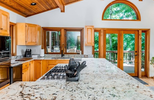 As pictured, the Chateau at Ferncliff has ample waterfront dining space with seating up to 14 people both inside or out. You'll find plenty of prep space and a fully equipped galley with all the expected tableware for a casual dining experience. A wet bar with seating between the living and kitchen areas will conveniently keep the beverages flowing without creating traffic issues in the kitchen. Massive deck space can seat many more. Multi-platform dock area is perfect for entertaining or lounging on a shady summer afternoon or enjoying an evening gathering with friends under the magic of a full moon and bistro lighting!