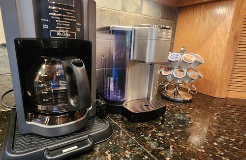 area, lives the gourmet kitchen. Appliances include 6 burner gas cooktop, double wall oven with warming drawer, large refrigerator with ice maker, separate beverage fridge, KitchenAid Mixer, both Keurig and drip coffee makers and every other appliance or serving piece desired for cooking, baking, and entertaining.