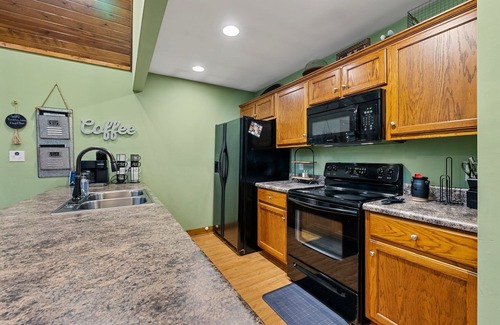 The cabin comfortably sleeps up to 12 guests in beds, with additional couch sleeping for up to 15. The main floor features two private bedrooms, each with a full bed, sharing a full bathroom. The second-floor loft offers an Amish-made twin-over-full bunk bed, a private ensuite bathroom with a stand-up shower, and a convenient workspace. The walk-out basement includes a second living area and game room, along with two bunk sets, one twin-over-full and one twin-over-twin, and also offer a third full bathroom.