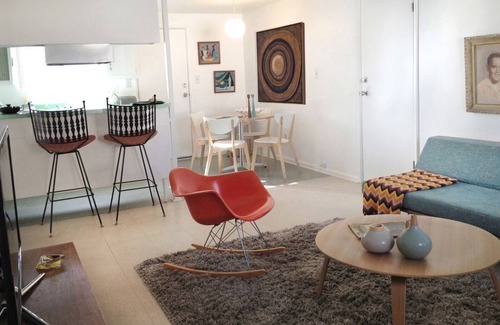 This mid-century modern boutique hotel complex is comprised of 5 spacious, fully furnished apartments. Comfortable, stylish "homes away from home" nestled in the hills of Desert Hot Springs. All units have full kitchens, baths, central heat, A/C. Pool & hot tub on site*. Original mid-century details throughout. The open floor plans lend themselves to casual living.