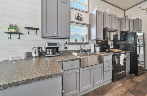 A tiny house for 2-4 people who just want to get away, or long to experience the amazing Texas wine country. Plenty of grapes are grown around this beautiful escape from the hustle and bustle of daily life. This beautiful front porch offers views for coffee in the mornings, gorgeous sunset painted evening skies, and stargazing that will take your breath away in the evenings. This beautiful house with all the comforts of luxury awaits your arrival. A King size bed (you read that right, King bed), queen size sleeper sofa, walk in tiled shower, 55" TV in the living room and a 32" TV in the bedroom, fireplace for those cool nights in the winter, and a fully functional galley kitchen stocked with supplies you might need.