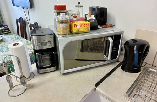 The bathroom (4 x 2m) has a shower cubicle, bath, valet stand and clothes rack. Soap, shampoo and foam bath are provided. The kitchen includes a full size fridge/freezer, stove, microwave, kettle, toaster and coffee machine. Teas and coffees are also provided.