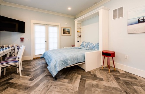 The Herringbone Suiteis a one bedroom, one bath suite located on the first floor ofThe Union Pier Summer Housewith its own private entrance and private outdoor deck overlooking Berrien Street that can accommodate up to four people. The bedroom has a King size storage bed with luxury linens and slipper chair. There is a deck outside this bedroom that overlooks the courtyard. The living area has a porcelain wood floor with a herringbone pattern, it includes a Queen size Murphy sofa bed. This suite includes aconvertible console table that opens up to serve as a dining table, has a42” LG Smart TV and a fully equipped kitchen. The luxury spa bathroom with Carrara herringbone marble tile includes a large walk in shower with multiple body sprays, a hand held shower, a rain shower, grab bars and a shower bench seat. A stackable washer and dryer is in thissuite. Two outdoor decks with bistro tables and chairs.Wi-Fi and USB