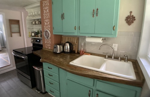 The entire cottage is about an 80 year old structure that has been recently renovated by us from the ground up. It has been a labor of love, from the live edge pine countertops, reclaimed barn wood, farmhouse sink to custom stenciled floors and refinished rustic furniture! The bathroom was entirely gutted and replaced and new floors are throughout most of the entire place. It is a charming combination of old and new, as we left the old wood stove and continue to make it the best we can in between guests!