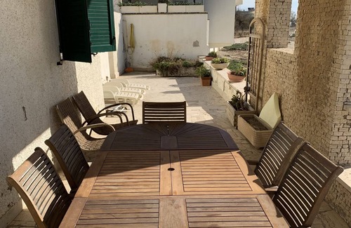 The apartment is on the ground floor of a two storey villa, which is part of a group of six villas facing a small bay. In the house there are the entrance, three bedrooms ( one on suite) and three bathrooms, a spare room, a big living room with a fireplace . From the living you go to a very big terrace, patly covered and from here with six steps you reach the beach which is sandy, but has some clifs at its ends (rich with mussels and, for expert divers octopus)
