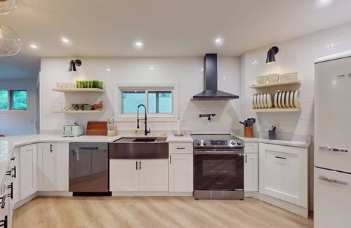 Once featured on HGTV, This unique fully renovated pyramid-shaped home features a stunning midcentury modern design. Inside, you'll find five bedrooms, three bathrooms, a 12-seat movie theater, and an arcade with retro games. Enjoy the spacious living room with a 60-foot ceiling where you can see the peak of the pyramid and four balconies. In the community, you'll have access to lakes, beaches, a ski lift, golf, a game room, a gym, tennis and basketball courts, barbecue areas, and an art center.