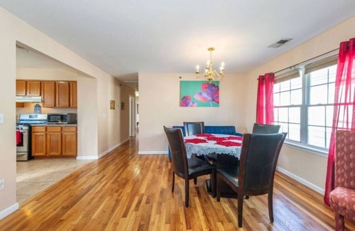 Spacious 5BR, 3BA home just 8 mins from EWR Airport and 22 mins to Times Square. Perfect for families, groups, and business travelers. Enjoy Smart TVs, high-speed Wi-Fi, central A/C, and a fully stocked kitchen with high-end appliances. Includes free parking for 2 cars, in-unit laundry, and a dedicated workspace. Minutes to Newark Penn Station for direct NYC access. Comfort, space, and location—all in one!