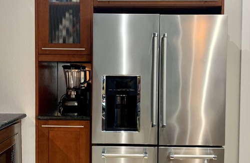 The state-of-the-art kitchen features a breakfast bar/island with seating for 4 persons and island sink; top-of-the-line appliances from the GE Monogram series to include cook top, oven, refrigerator with ice maker, microwave – Kitchen accessories include coffee maker, toaster, blender and complete dinner service for 6.