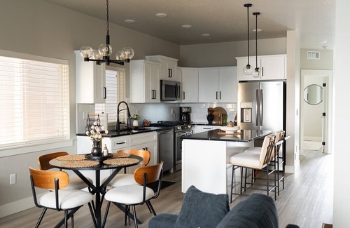 Upstairs, two spacious bedrooms each feature private en-suite bathrooms. Downstairs a third bedroom is paired with a full bath-ideal for guests who prefer to avoid stairs. The open living area is perfect for relaxing after a day of Boise adventures, and the fully equipped kitchen makes it easy to enjoy meals at home. Start your day with a coffee on the inviting front porch, and end it by cozying up in the living room with your favorite show or book.