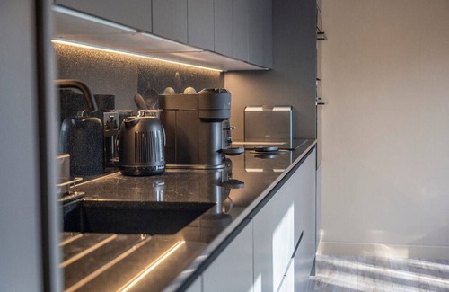 As you enter the hallway, light floods in from the floor-to-ceiling windows on the right, and this leads to the light and airy open-plan kitchen with a dining area. The kitchen is fully fitted and equipped with all mod cons including: an induction hob, with induction safe pots and pans, integrated eye-level oven, microwave, full-size fridge/freezer, integrated dishwasher and a Nespresso Veruo coffee machine.