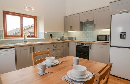 The living areas in the reverse-level, semi-detached barn conversion consist of a first-floor open-plan living space with a kitchen offering an electric oven and hob, a fridge, a dining area with seating for two people, and a sitting area with a TV and woodburning stove, alongside a utility room housing a washing machine. There is one king-size bedroom with an en-suite bathroom, as well as a cloakroom. Outside, there is sheltered off-road parking, and a sheltered seating area with furniture. Within 3.1 miles, you'll discover a shop, and within 2.5, a pub. One well-behaved pet is allowed, but smoking is not. WiFi, fuel, power, a starter pack for the stove, bed linen and towels are all included in the rent. A rural getaway with your loved one awaits at The Granary 1. Note: Guests have access to the neighbouring B&B's tennis/badminton room.