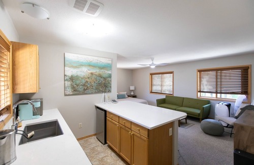 The apartment over the garage has a King bed, bathroom with a shower and a kitchenette with a microwave, sink and mini-refrigerator and a Smart TV.