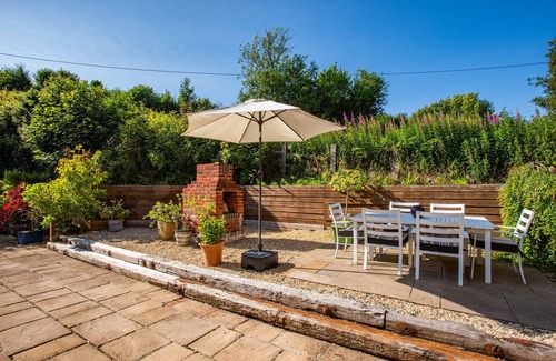 The enclosed patio/garden area is to the rear of The Old Laundry. Double doors open from the living area onto the patio, there are two steps up to the garden furniture, comprising a table with six chairs and a large parasol, fire pit/bbq and gravel area with some potted plants (no grass).