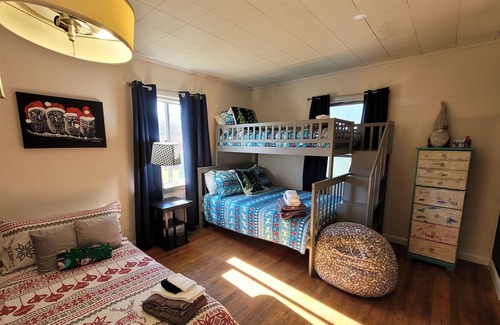 The Polar House features a king-size bed in one bedroom with Smart TV, two twin-size beds & full bed (bunk bed) with a twin trundle (5 beds total) in the second bedroom with a Smart TV, a full bathroom, full kitchen, and high-speed internet throughout.