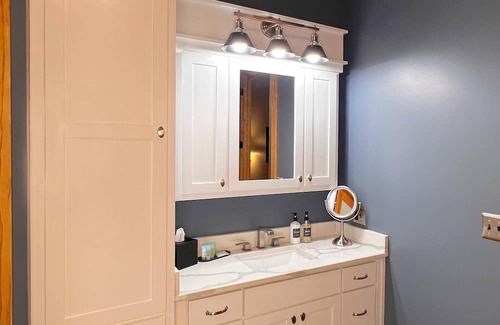 The property also includes two full bathrooms, each with a walk-in shower, towels, and washcloths. Additionally, the main bathroom boasts a relaxing jacuzzi tub. You'll also find an extra large walk-in closet with luggage racks, as well as a separate closet housing a washer and dryer.