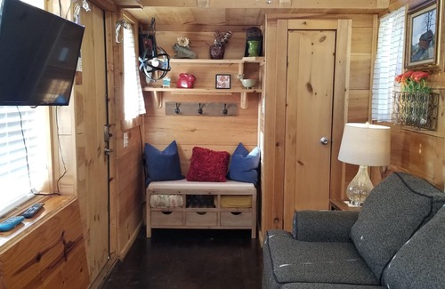 The Rosebud Tiny Home is a stylish rustic home 336 sq ft with a queen size bed in the loft. Wake up to a view of our horse pasture and amazing sunrises. Full kitchen and bathroom. Located on 10.5 acers with horse, Hollywood donkeys (featured on our episode of House Hunters on HGTV), a pet pig and 2 VERY friendly yard cats. At night sit around the out door sitting area enjoy the fire pit and view of the stars in the night sky